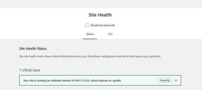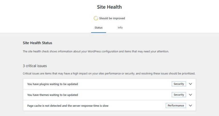 Ein einfacher Indikator ist der Site Health Status. Stehen dort Hinweise wie dieser, besteht Handlungsbedarf: